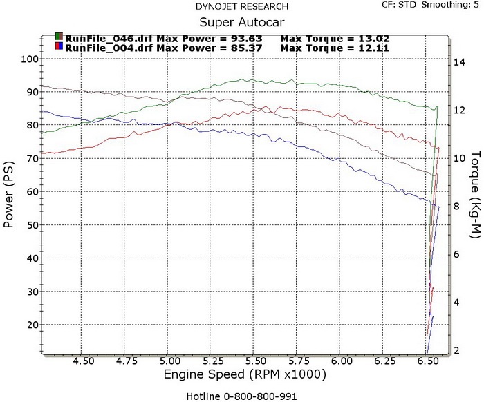 แต่อย่ามองว่าเพิ่มม้าแค่ 8 ตัวจะเพิ่มไปทำไม? ให้ลองดูแรงบิดที่ได้เพิ่มมาก่อน แรงบิดนี่ล่ะคือสิ่งที่ถีบรถเราไปข้างหน้าใช่ไหม? และดูจากกราฟแรงบิดหลังจูนที่ยกตัวขึ้นตลอดตั้งแต่ 4,500 รอบ ไปจนหมดรอบ ก็ชี้ให้เห็นแล้วว่า ถ้านำว่าวิ่งบนถนนจริงรถที่จูนแล้วเข็มวัดรอบจะกวาดไปไวกว่าดูแรงบิดสูงสุดสิครับ ก่อนจูนที่ 4,500 รอบต่อนาที มีประมาณ12 ก.ก.ม. แต่หลังจูนจะเห็นได้ว่าเครื่องยนต์สามารถคงแรงบิดระดับนี้หรือสูงกว่า ให้ใช้ไปจนถึงรอบเครื่องประมาณ 5,500 รอบต่อนาที แม้ว่าลักษณะของกราฟจะมีความโค้งขึ้นและลงเดินรอยตามเส้นของเดิมเพราะยังไม่ได้โมดิฟายแค็มหรือฝาสูบก็ตาม